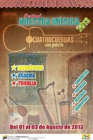 Del 1° al 3 de agosto se efectuará en los estados Anzoátegui, Aragua y Trujillo el Festival Nacional Nuestra Música 2013 en conmemoración del natalicio de Hugo Chávez y como parte de la celebración del programa Cuatro Cuerdas una Patria, puesto en marcha por el Ministerio del Poder Popular para la Cultura (MPPC).